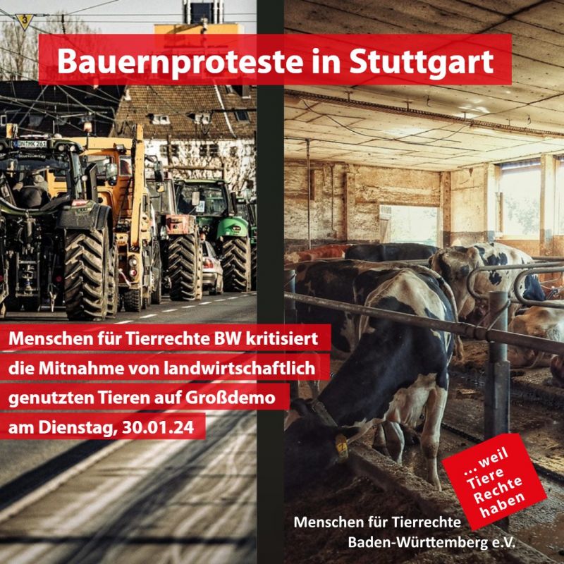 Menschen für Tierrechte Baden-Württemberg kritisiert die heutigen Bauernproteste in Stuttgart, auf welche mehrere Landwirt*innen ihre genutzten Tiere mitnahmen. So wurde zum Beispiel zum Protest auf dem Kernerplatz in Stuttgart eine Kuh mitgenommen. Dass eine Kuh, die vermutlich bisher nur auf einem landwirtschaftlichen Betrieb gelebt hat, sich auf einer Großdemo nicht wohlfühlt, sollte jedem Landwirt*in klar sein. Mit solchen Aktionen tun sich die Landwirt*inen keinen Gefallen, zeigen sie doch nur, dass sie fühlende Lebewesen wie Gegenstände behandeln.