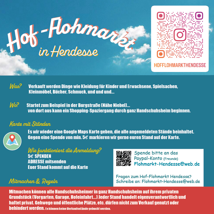 Hinweis: Mitmachen können alle Handschuhsheimer*innen, in ganz Handschuhsheim auf ihrem privatenGrundstück wie Vorgarten, Garage, Hofeinfahrt.. Jeder Stand handelt eigenverantwortlich und haftet privat. Gehwege und öffentliche Plätze etc. dürfen nicht zum Verkauf genutzt oder behindert werden. Es können keine Stände gebucht werden!