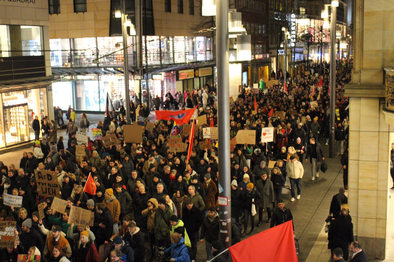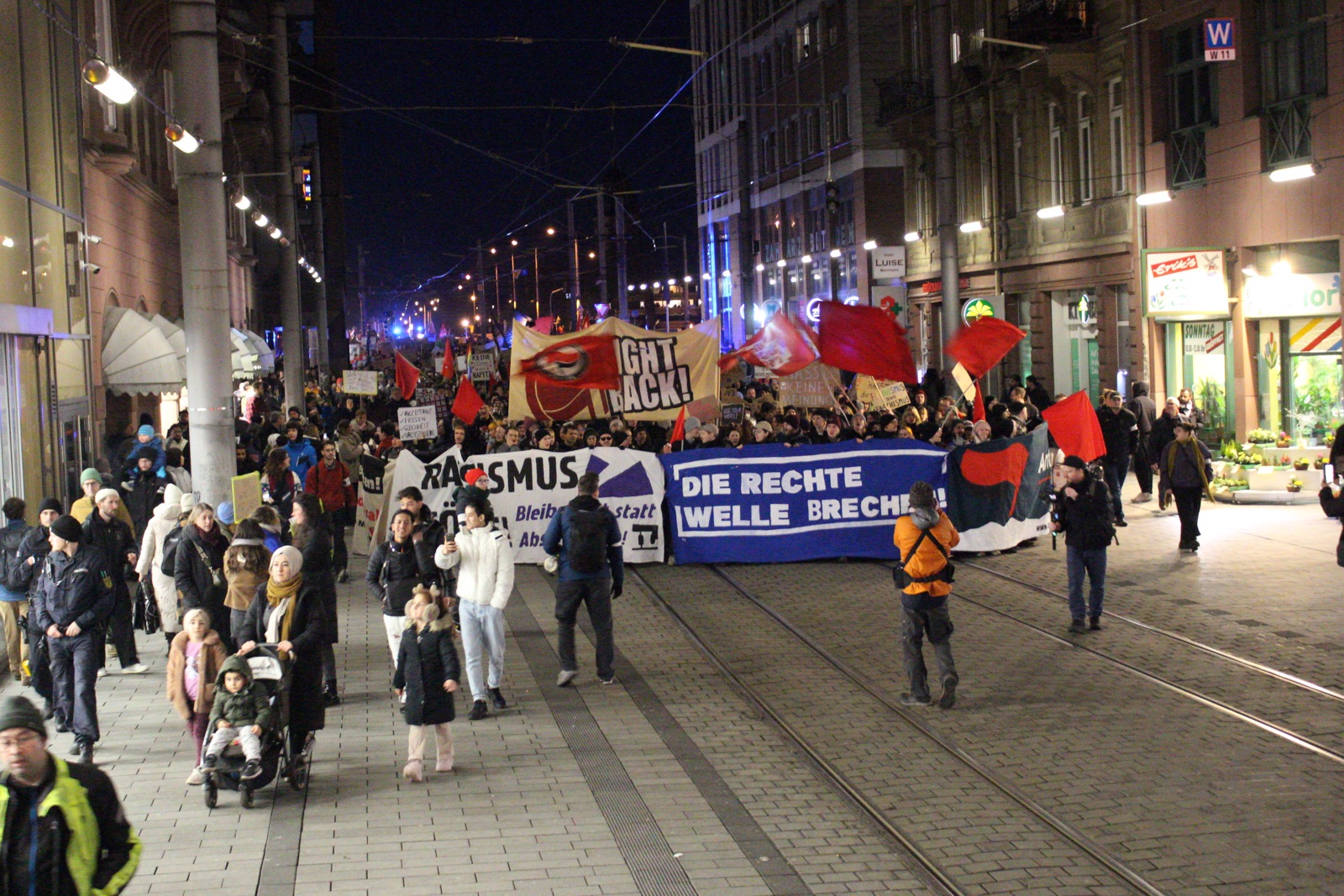 Rechtsradikalen sind nur die Schaumkrone des Rechtsrucks. Genauso ist die Forderung von Olaf Scholz aus dem letzten Herbst, "endlich im großen Stil abzuschieben" Teil der gesellschaftlichen und politische Rechtsentwicklung." Das offene antifaschistische Treffen Mannheim betonte: "Nur wenn wir es schaffen, aus der aktuellen Empörung eine breite und nachhaltige Bewegung gegen Rechts zu formen, haben wir eine Chance den Rechten Vormarsch zu stoppen." Die Demonstrant*innen riefen Parolen wie "Alle zusammen gegen den Faschismus", "Nazis morden, der Staat schiebt ab – dass ist das gleiche Rassistenpack" und "Um Europa keine Mauern – Bleiberecht für alle und auf Dauer!".