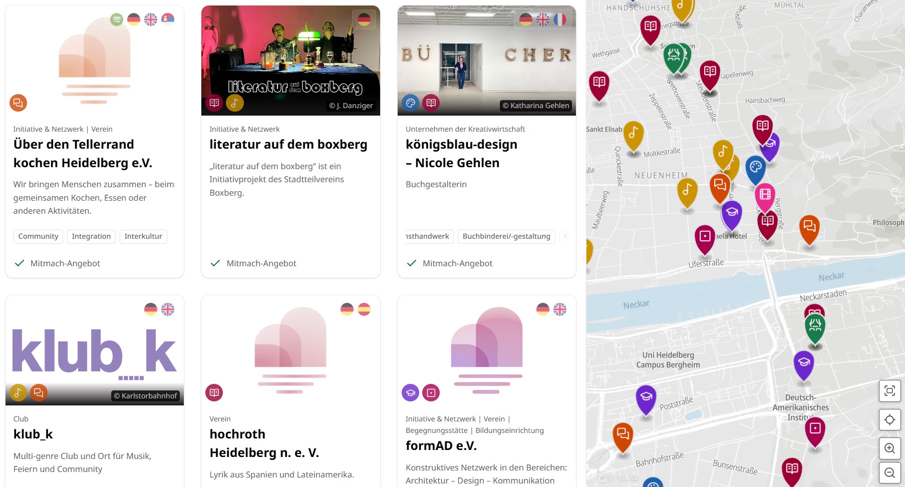 Die Plattform bietet Bürgerinnen und Bürgern sowie Besucherinnen und Besuchern einen strukturierten Überblick über die kulturelle Vielfalt der Stadt. Über verschiedene Filterfunktionen können unter anderem Sparten, angebotene Sprachen sowie Kooperations- und Mitwirkungsmöglichkeiten gezielt ausgewählt werden. Mit einem Klick auf einen Standort öffnet sich die Ansicht mit weiteren Informationen zum Angebot und den kommenden Terminen. Ebenfalls verlinkt sind für die weitere Recherche der städtische Veranstaltungskalender, die Raumkarte der Stadt Heidelberg mit buchbaren Veranstaltungsorten und der Online-Stadtführer für Menschen mit Behinderungen Heidelberg hürdenlos.